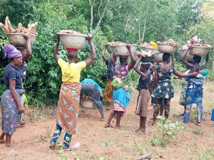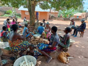 « La personne qui nous a donné l’information nous a demandé de nous constituer en groupes de dix (10), et que chaque groupe définisse clairement l’activité qu’il voulait mener. Ce que nous avons fait. Mon groupe a choisi la transformation du manioc en gari, mais aussi en gâteaux indigènes. »