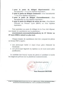 Selon un communiqué signé le vendredi 06 février 2026 par le Secrétaire général de l’institution, Dr Gani Romuald Irotori, ces observateurs seront recrutés parmi des citoyens béninois disposant d’une bonne connaissance du terrain et d’une disponibilité avérée. Les niveaux de qualification exigés varient selon le poste, allant du BEPC au BAC+4.